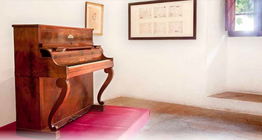 Le pianino sur lequel Chopin a composé n’est aujourd’hui plus utilisable (ci-dessus : il est exposé au Musée Chopin/Sand de Majorque, à Valldemossa), mais un autre, identique (« son jumeau » selon l’expression de Justin Taylor), construit la même année, soigneusement restauré par la minutie d’Olivier Fadini, a été utilisé par Justin Taylor pour son enregistrement, et était ce jour devant le public, de dos pour que le son soit projeté avec une « puissance » maximale, bien grand mot puisque le son demeure particulièrement feutré.