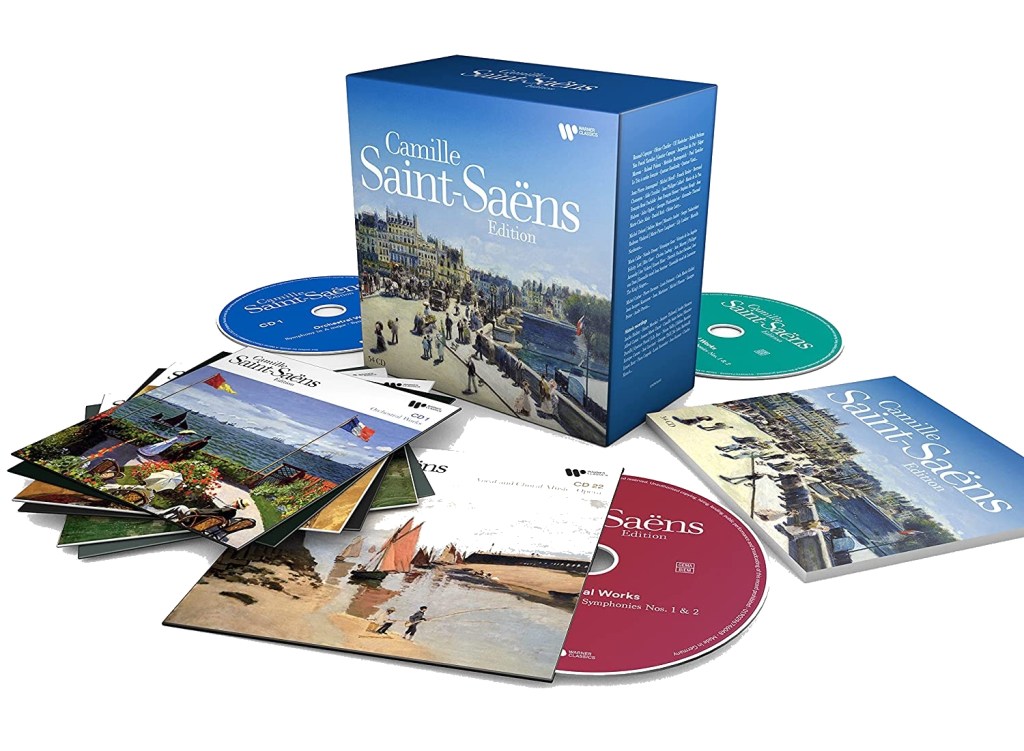 Fort heureusement (car je crois qu’il faut plutôt s’en féliciter que de rechigner), les grandes majors de l’industrie du disque ont pris l’habitude de marquer les célébrations liées à la postérité des compositeurs, par la sortie d’énormes coffrets reprenant les enregistrements de leurs catalogues. Il vaut mieux juger sur pièce, car si l’intention est louable (même si elle repose aussi sur des considérations commerciales), ces initiatives peuvent relever soit du recyclage, soit de belles mises en perspective éditoriale. Dans le cas de l’imposant coffret Camille Saint-Saëns publié par Warner Classics à l’occasion du centenaire de la mort du compositeur en 2021, je crois qu’on peut le dire : il s’agit là d’une belle réussite et qui plus est, d’un bel instrument de diffusion au service de cette postérité longtemps problématique d’une œuvre considérable. Car c’est bien cette prise en compte de la globalité de cette œuvre que permet une telle réalisation : nous remettre devant les yeux à la fois la diversité et l’ampleur du catalogue Saint-Saëns. Comme le rappelle l’une de ses meilleures spécialistes, Marie-Gabrielle Soret (Diapason de novembre 2021), pour lui qui proclamait volontiers « Je fais de la musique comme un pommier produit des pommes », pas un seul genre musical dans lequel ce boulimique de création ne se soit brillamment illustré, mis à part peut-être le piano seul, tant il a préféré faire dialoguer son instrument avec l’orchestre ou dans le cadre de la musique de chambre : « Œuvres pour instruments solistes, musique de chambre, symphonies, concertos, mélodies, cantiques, cantates, hymnes, odes, messes, chœurs, requiem, musiques de scène, oratorios, opéras… : il n’est pas un genre que Saint-Saëns n’ait abordé ».