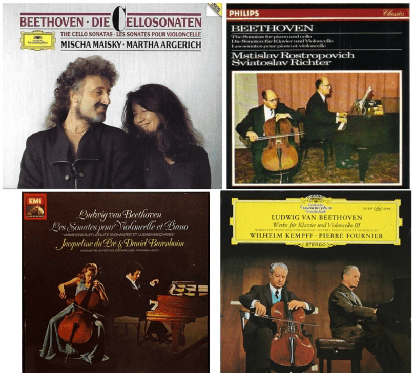 Quelques morceaux de bravoure de ces grands aînés, surtout autour de la sonate N° 2 en sol mineur op. 5 : Misha Maisky / Martha Argerich en 2020 (leur intégrale date de 1991 et 1993) ; Daniel Barenboim / Jacqueline du Pré en 1976 ; Pierre Fournier / Wilhelm Kempff en 1966 ; Mstislav Rostropovitch / Sviatoslav Richter en1963 (leur intégrale date de 1963 et 1967) :