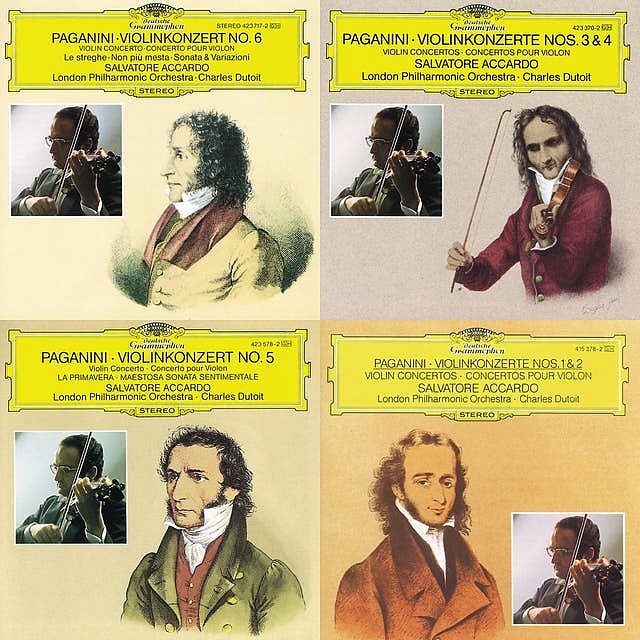 Ces enregistrements sont un ravissement de précision et bien sûr de virtuosité aussi époustouflante que maîtrisée. Et pour ceux (nombreux) qui ne parviennent pas à reconnaître l’intelligence simplement musicale de Paganini en dehors de la virtuosité violonistique, cette véritable somme saura montrer combien, certes autour du violon comme pivot de l’écriture, ses partitions ne sont pas uniquement des supports servant à faire briller l’instrument : il se dégage notamment des six concertos une sorte de brio romantique remarquable en soi. Et même si l’orchestre demeure un faire-valoir du soliste (en réalité, pas plus que chez le Chopin des concertos pour piano), cette musique conçue autour de l’instrument recèle une beauté farouche qui va droit à qui l’écoute, le saisissant entre quatre cordes, une « âme » en bois et les crins d’un archet. Il s’agit d’une musique essentielle, conçue PAR et POUR le violon : la nuance est là. Salvatore Accardo et Charles Dutoit excellent dans la transmission limpide de cet art violonistique, en conférant à chacune des pièces son caractère propre. Une merveille. Ci-dessous, à gauche, le concerto N° 1 et à droite, l’allegro du concerto N° 4.
